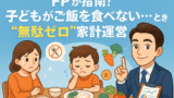 【徹底検証】子ども1人に本当にかかる教育費、FPがリアル家計簿で全額公開!の日本語バナー画像。悩んでいるママ・パパと、将来を考える子ども、家計簿や通帳、グラフのイラストが明るく描かれている。 【1】家計管理・節約